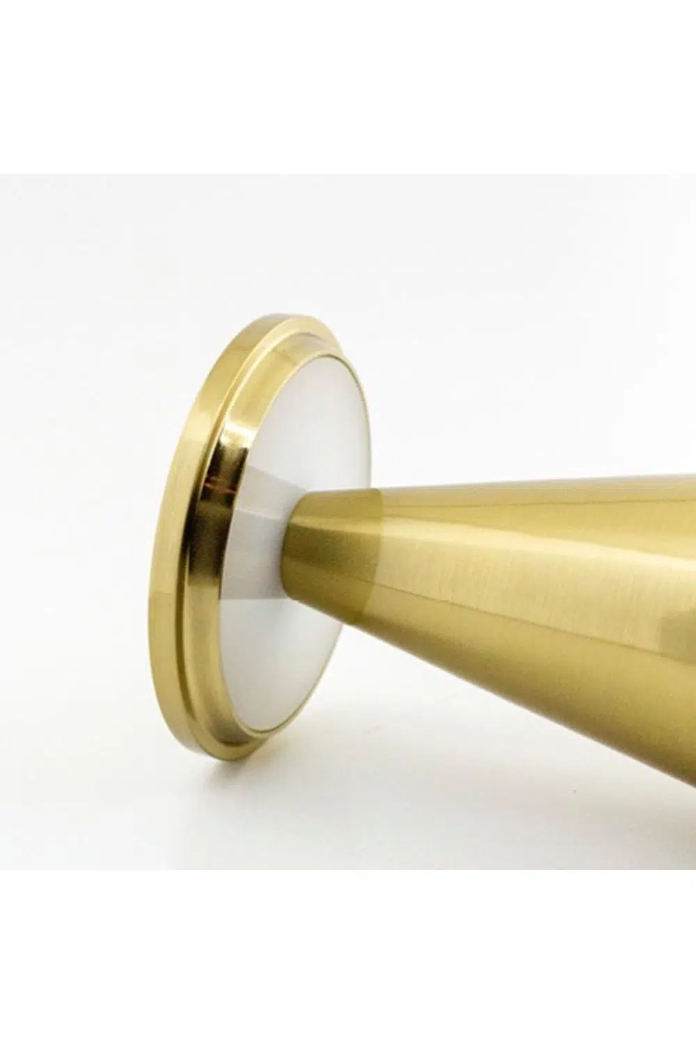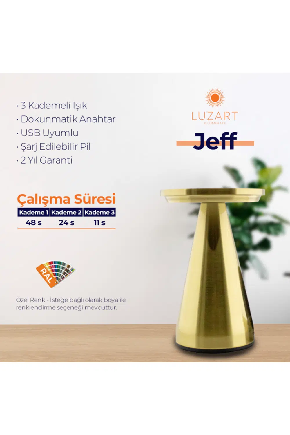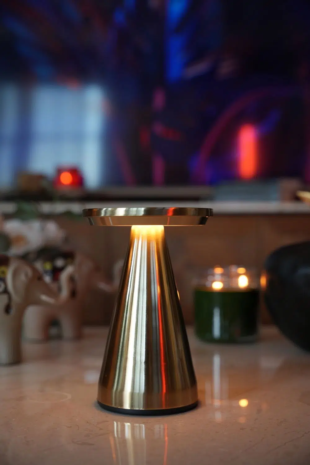 Jeff masa lambası, altın renkli metal gövdesi ve net geometrik yapısıyla, modern dekorasyonlara zamansız bir şıklık katar. Hem işlevsel hem de estetik bir çözüm arayanlar için özel olarak tasarlandı. Taşınabilir, şarj edilebilir ve her mekânda fark edilir.