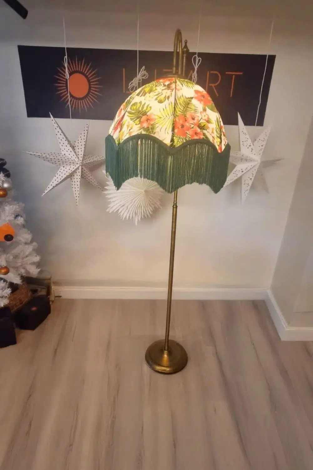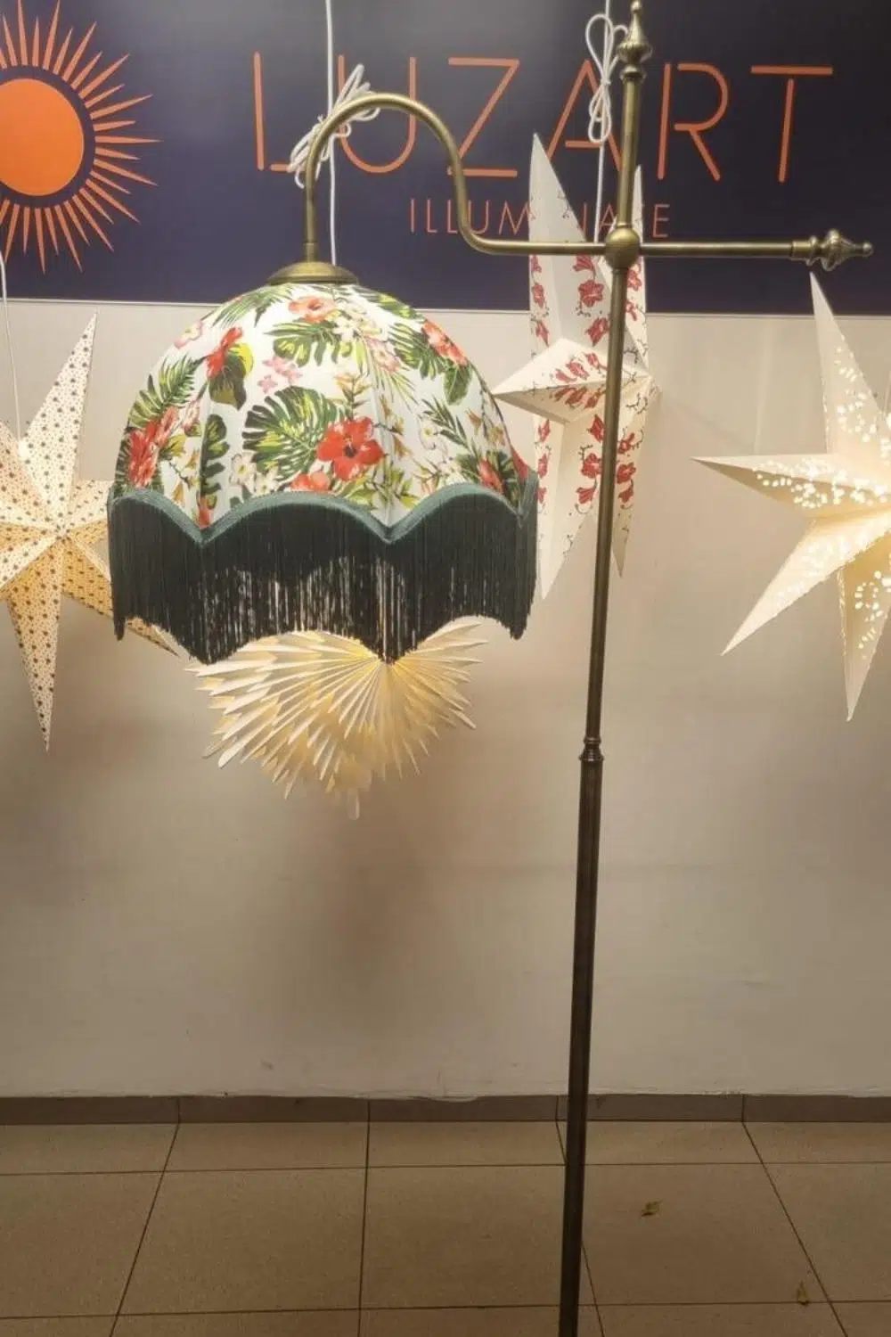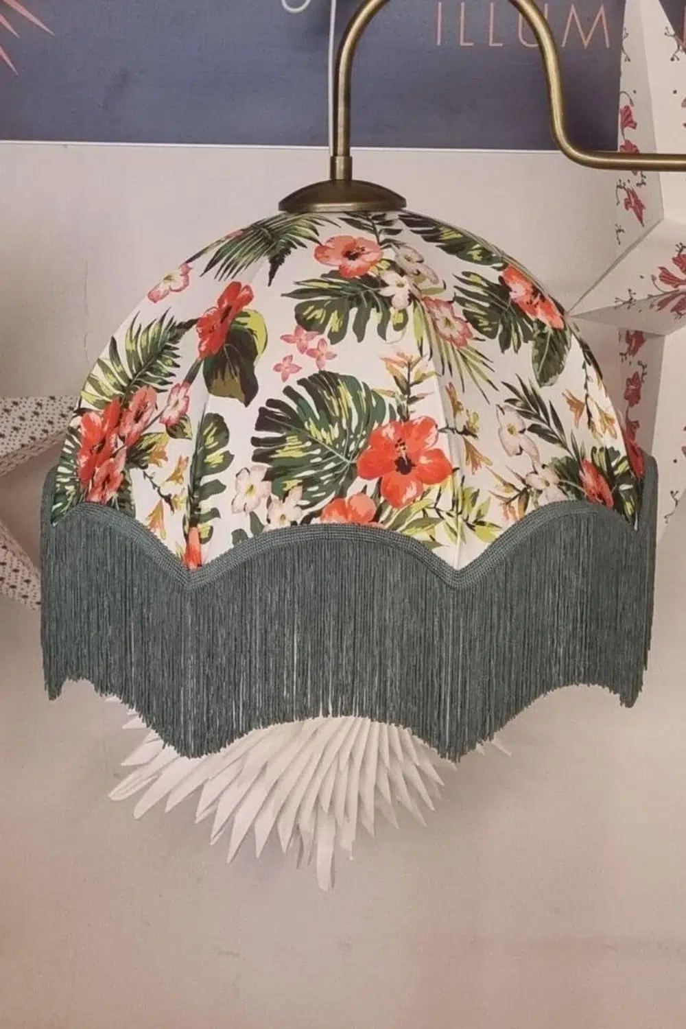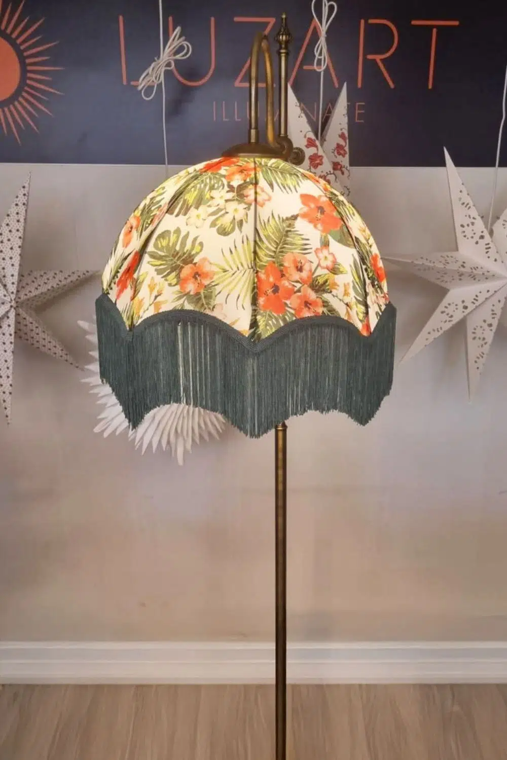 Malzeme: Tropikal desenli kumaş kaplama, püsküllü abajur, metal gövde