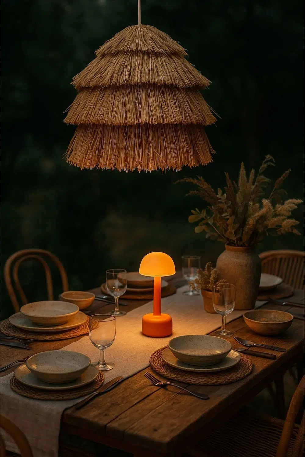 Geleneksel çatı sazlarından esinlenerek kat kat örülen formu, sizi doğanın içinde bir kulübeye davet eder gibi.