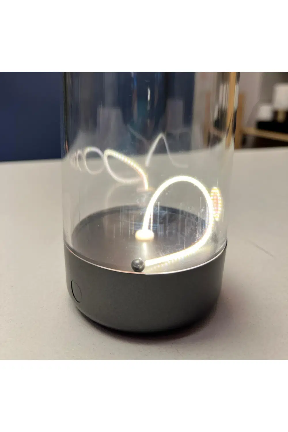 LED ışık, cam hazne içinde manyetik alan sayesinde serbest ve dengeli bir şekilde hareket eder.