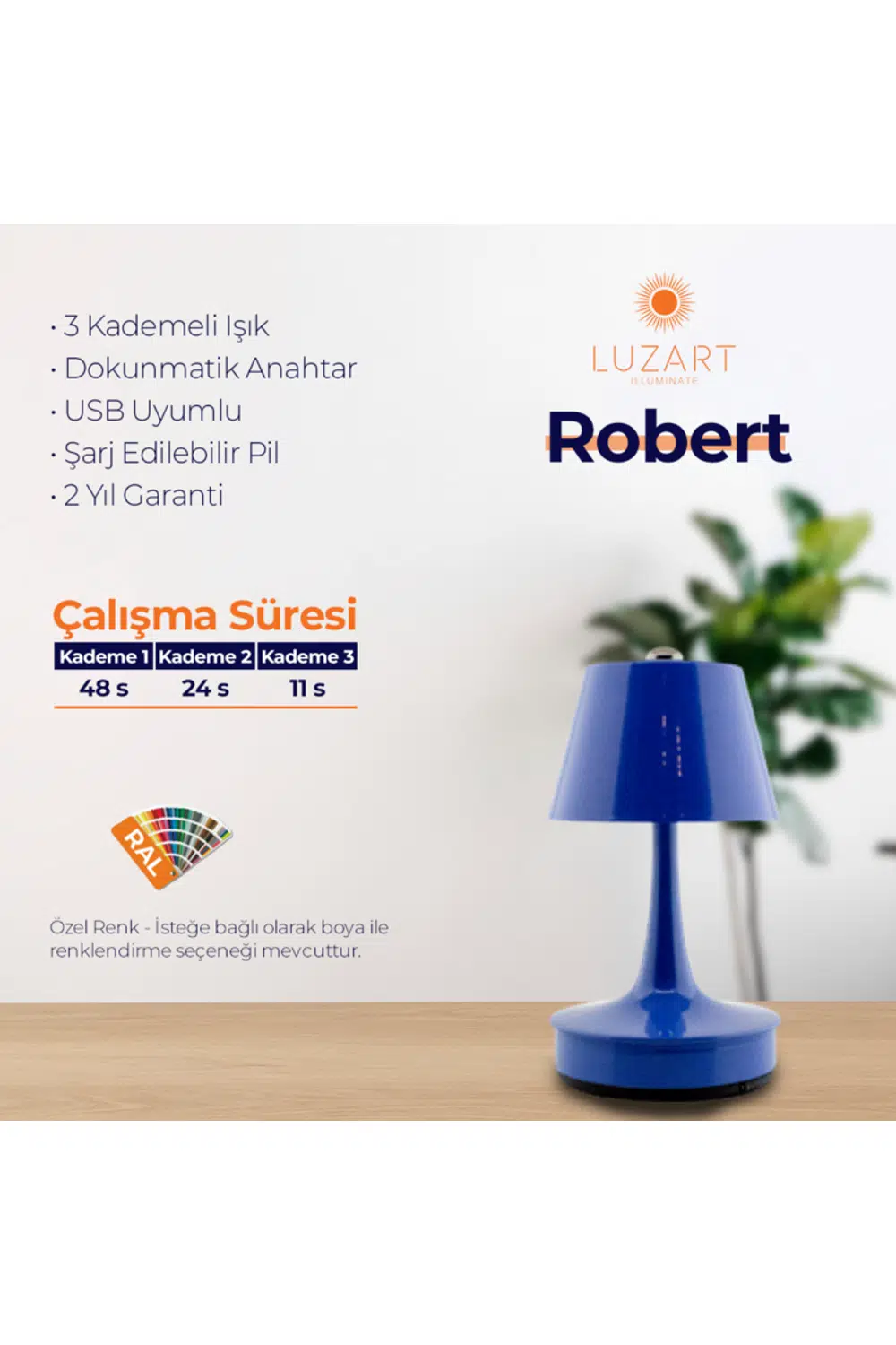 Robert masa lambası, şık tasarımı ve uzun pil ömrü ile her mekânda fark yaratır. Yumuşak ışık seçenekleri ve kullanım kolaylığı sunan dokunmatik anahtarı sayesinde, evde, ofiste veya seyahatlerinizde rahatlıkla kullanabilirsiniz. \n \nÖne Çıkan Özellikler: \n \n3 Kademeli Işık: \n \nKademe 1: 48 saat \nKademe 2: 24 saat \nKademe 3: 11 saat \n \nDokunmatik Anahtar: Kolay ve pratik kullanım. \nUSB Uyumluluğu: Rahat şarj imkanı. \nŞarj Edilebilir Pil: Kabloya ihtiyaç duymadan kullanım. \nGaranti: 2 yıl güvence. \n \nÖzel Renk Seçenekleri: \n \nRAL paletinden tercih edeceğiniz renklerle kişiselleştirilebilir. \n \nRobert, estetik görünümünün yanında işlevselliğiyle de her ortamda mükemmel uyum sağlar. Enerji verimliliği sağlayan bu lamba, özellikle çalışma masaları ve oturma odaları için idealdir. \n \nRobert ile modern tarzda aydınlatmanın keyfini çıkarın!