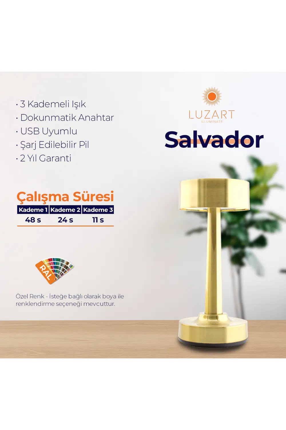 Salvador masa lambası, göz alıcı altın kaplama tasarımı ve şık detayları ile her ortamda sofistike bir görünüm sunar. Minimalist yapısı sayesinde modern iç mekanlarla kusursuz bir uyum sağlar. Salvador, estetiğin yanı sıra kullanışlı özellikleriyle de dikkat çeker. \n \nÖne Çıkan Özellikler: \n \n3 Kademeli Işık: \n \nKademe 1: 48 saat \nKademe 2: 24 saat \nKademe 3: 11 saat \n \nDokunmatik Anahtar: Tek dokunuşla kolay kullanım. \nUSB Uyumluluğu: USB Type-C ile hızlı ve pratik şarj. \nŞarj Edilebilir Pil: Taşınabilir aydınlatma deneyimi. \n2 Yıl Garanti: Güvenli ve uzun ömürlü kullanım. \n \nRenk Seçenekleri: \n \nRAL renk paleti ile özel boyama seçenekleri sunulmaktadır. \n \nAltın detayları ve zamansız formu ile Salvador masa lambası, otellerden restoranlara, ofislerden ev dekorasyonlarına kadar her mekanda kendine özgü bir atmosfer yaratır. Elektrik kesintilerinde bile şarjlı yapısıyla kesintisiz aydınlatma sunar. \n \nSalvador ile lüksü ve işlevselliği aynı anda yaşayın! \n \nÖlçüler : \nYükselik :22 cm \nÇap: 10 cm \n \nAltın detaylarıyla göz kamaştıran Salvador, şarj edilebilir özelliği sayesinde hem özgür hem şık bir kullanım sunar. Dekorasyonuna değer katmak isteyenler için mükemmel bir seçim.