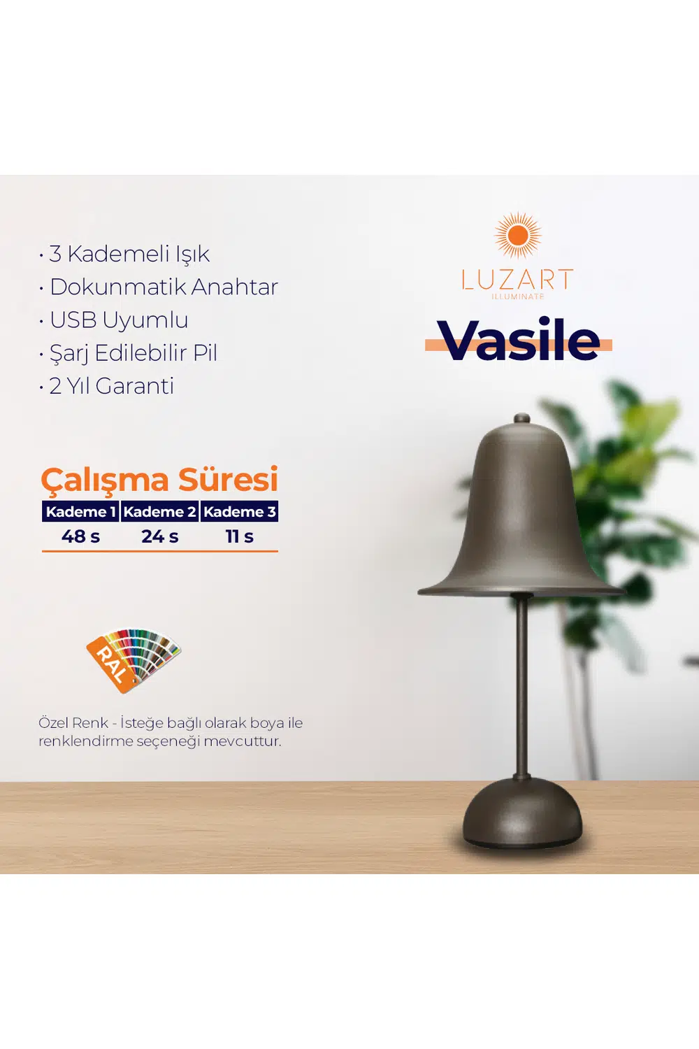 Luzart’ın sanat ve teknolojiyi buluşturan koleksiyonundan Vasile, yaşam alanlarınıza yalnızca ışık değil, anlam da getiriyor. Yalın ama güçlü tasarımıyla mekânın ruhunu zamanında yakalayan bu şarjlı masa lambası, estetikle işlevselliği bir araya getiriyor. Dokunmatik kontrol, kablosuz kullanım ve yüksek batarya performansıyla fark yaratır.
