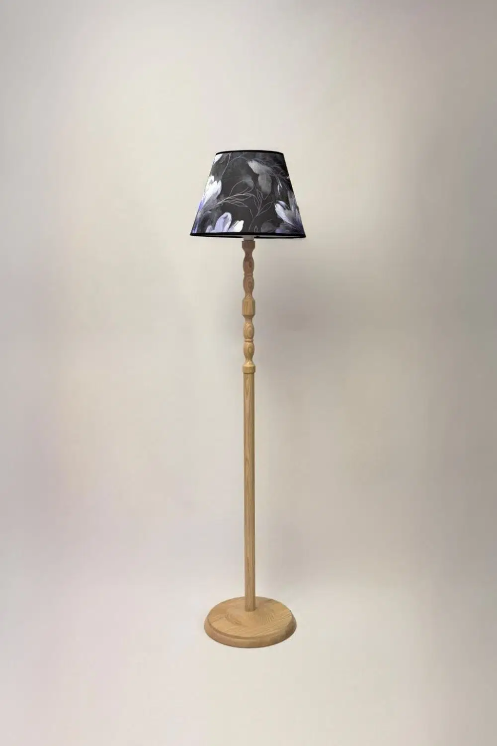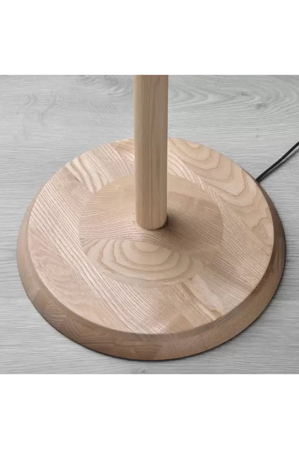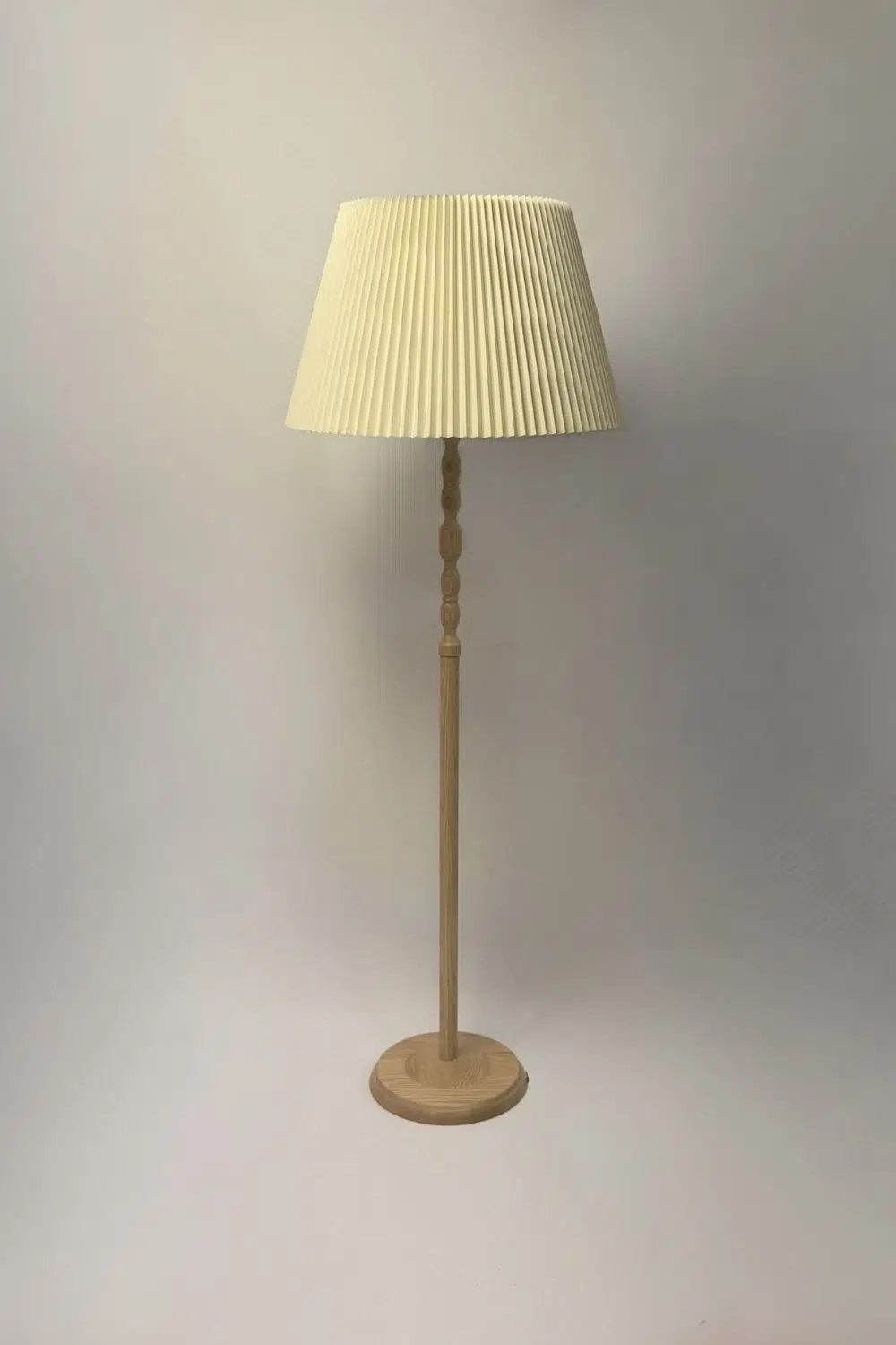 El işçiliğini çağrıştıran gövde oymaları, doğal meşe tonundaki yüzeyi ve kırık beyaz tekstil şapkası ile sakin ama karakterli bir atmosfer yaratır.