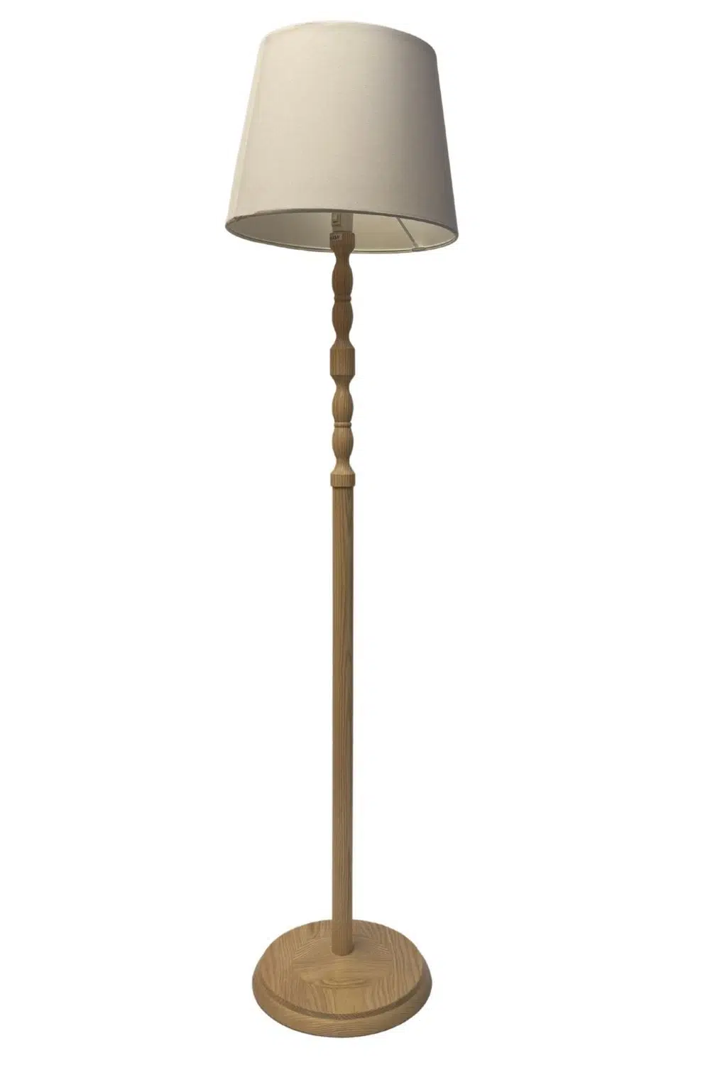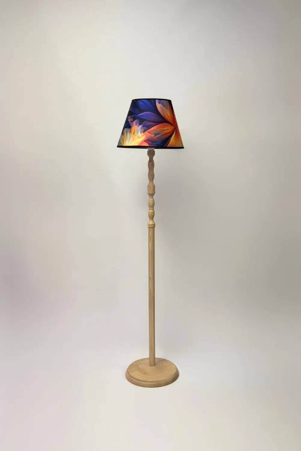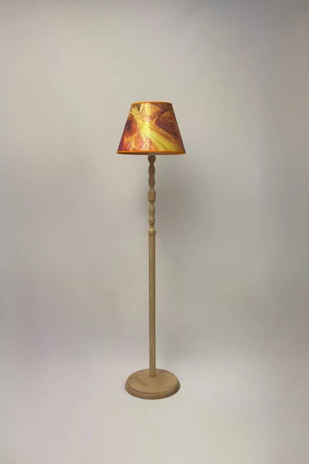 El işçiliğini çağrıştıran gövde oymaları, doğal meşe tonundaki yüzeyi ve kırık beyaz tekstil şapkası ile sakin ama karakterli bir atmosfer yaratır.